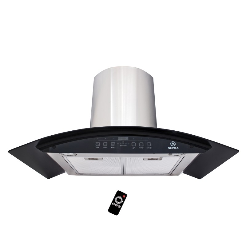 CAMPANA CC-90-ACCampana extractora de cristal curvo templado tipo pared para 90 cm con controles touch y display retroiluminado.Motor tipo turbina de 211 W con capacidad de extracción máxima de 630 m³/h.Nivel de ruido mín. 55 dB – máx. 58 dB.Reloj digital en display retroiluminado (cuando está encendida).3 velocidades de extracción al exterior.Panel de control touch con iluminación en colores azul y rojo.2 módulos de luz LED (Luz fría) de 2 W de potencia cada uno.Temporizador de 1 minuto al presionar una vez el botón de apagado, o bien accionando con el control remoto.Medidas: Altura: 36 cm Frente: 89.5 cm Fondo: 47 cm Peso: 13.5 kgVolumen (m3): 0.181Voltaje: 110 – 127 V~ 60 Hz 214 W