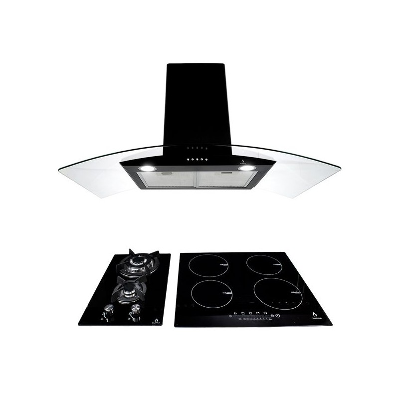 CAMPANA CC-90-BLACKCampana extractora con cristal curvo decorativo de tipo pared de 90 cm.Filtros de acero removibles y lavables atrapa grasa.Motor tipo turbina de 143 W con capacidad de extracción máxima de 460 m³/h.Panel con botones mecánicos.3 velocidades de extracción.2 módulos de luz LED.Medidas: Altura: 36cm X Frente: 89.5cm X Fondo: 47cm X Peso: 13.5kg.